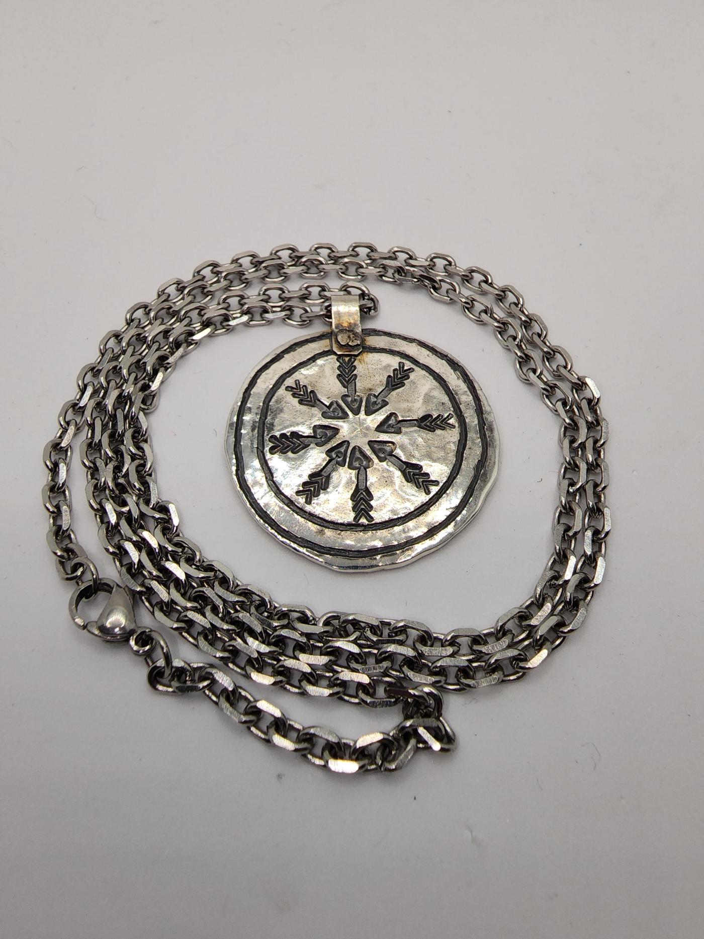 I ended up casting a flat round slug from about an ounce of silver, hammering it out a bit more to make it more coin-like, stamping all the details on, riveting on a bale, and finally hitting the indentations with a little liver of sulfur to blacken them. Hung it on a silver chain I had on-hand, rather than constructing one this time. Ended up looking like this: