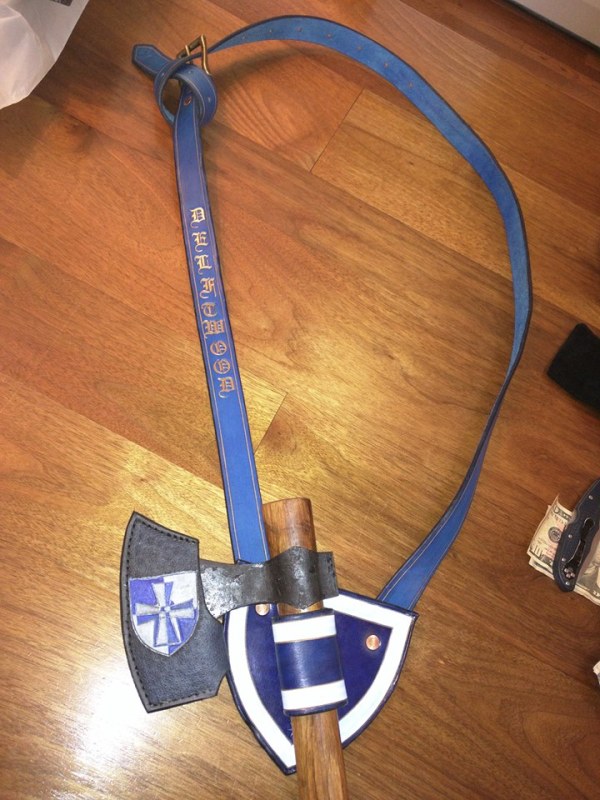 I made a simple welted mask for the axe, tooled the Delftwood windmill onto it, dyed it all blue, and used white oil-based paints to detail the windmill. I glued it together, and sewed it on my Tippmann Boss machine. I used a belt sander to make the sewn edges uniform, melted beeswax into them, and burnished them smooth and hard.